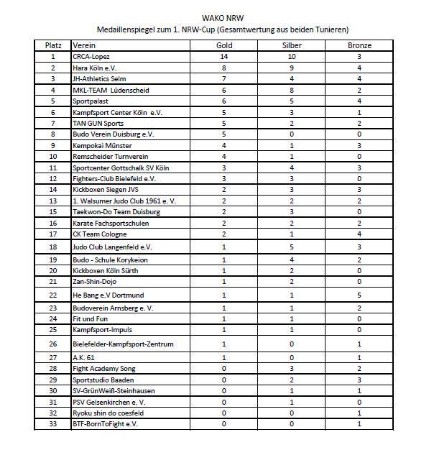Am 24.05.2014 fand in Duisburg die Landesmeisterschaft in NRW statt. 230 Starter aus 28 Vereinen kämpften in den Disziplinen VK, LK, Pointfight sowie im Bereich der Formen um die Qualifikation für die Deutsche Meisterschaft der WAKO Deutschland. Unser Verein startete mit acht Sportlern in der Disziplin Pointfighting und konnte in der Gesamtwertung, unter allen Vereinen, den zweiten Platz in der PF-Rangliste belegen. Sowohl in der Jugend- als auch bei den Erwachsenen gingen einige Sportler zum ersten Mal an den Start.